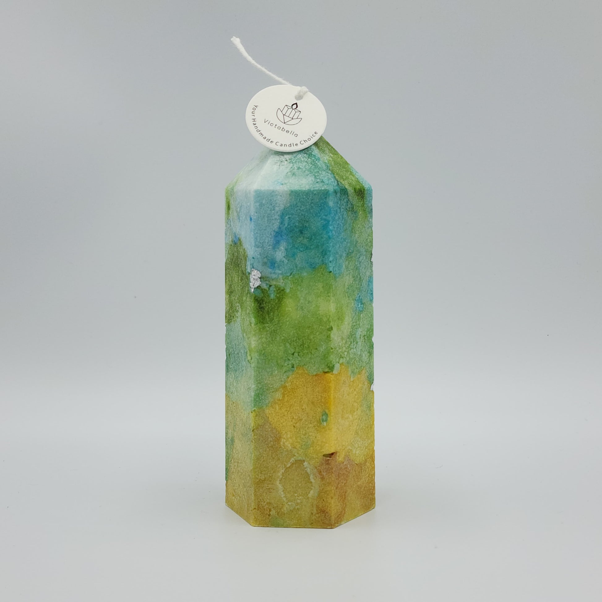 Infused with the colors of nature lush greens, sky blues, and golden earth tones, this candle evokes a sense of renewal and grounding energy. A beautiful accent for mindful spaces and peaceful moments.